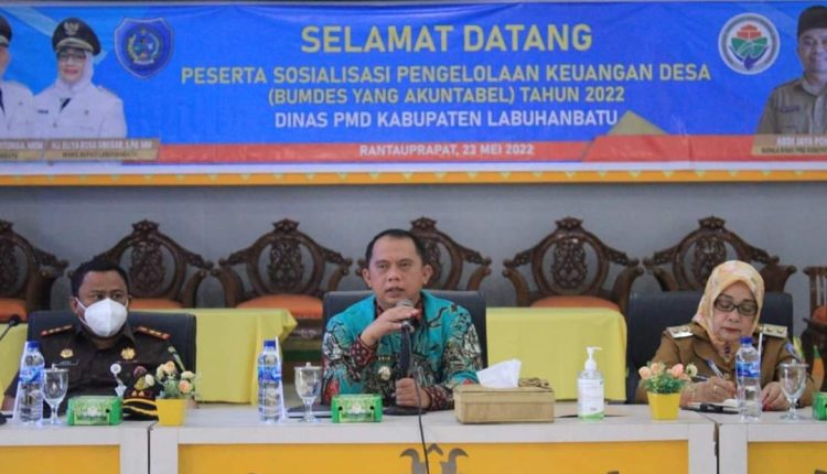 LABUHANBATURAYA.com- Bupati Labuhanbatu dr. H. Erik Adtrada Ritonga, MKM dan Wakil Bupati Labuhanbatu Hj. Ellya Rosa Siregar, S.Pd. MM, membuka Sosialisasi Pengelolaan Keuangan Desa (BumDes Yang Akuntabel) Tahun 2022, di Ruang Data dan Karya Kantor Bupati Labuhanbatu, Senin (23/05/2022).